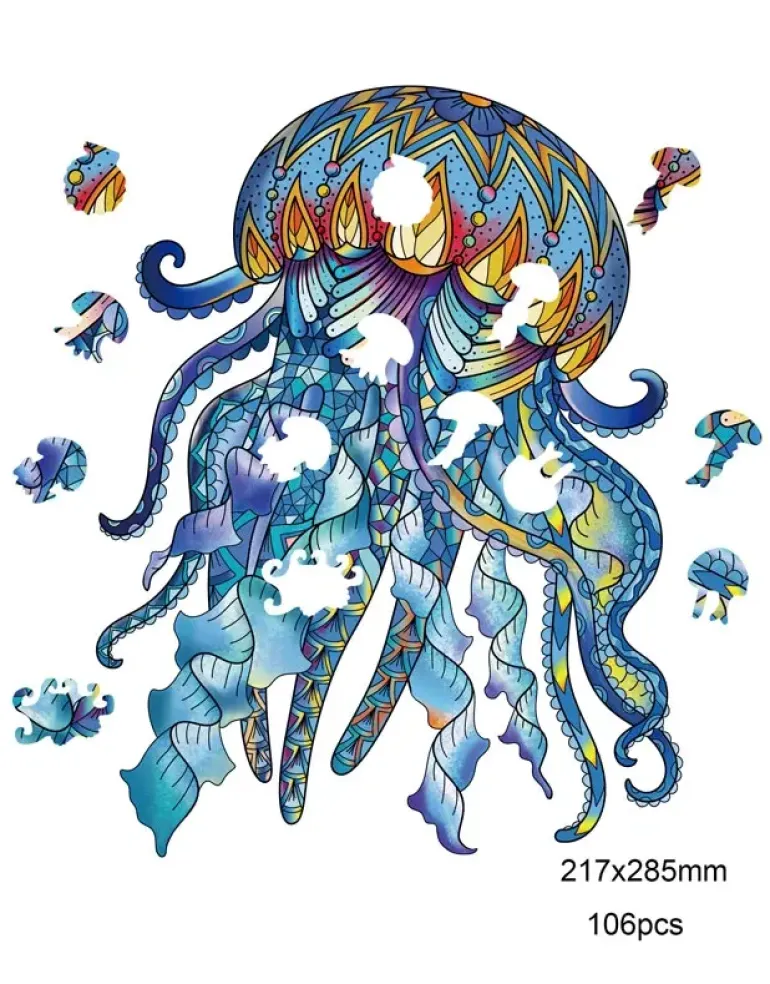 Träpussel med form av en manet i blått med röda och gula detaljer.