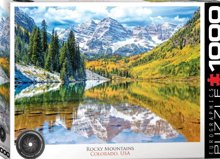 Det är en krispig och solig höstdag i nationalparken Rocky Mountains i Colorado, USA. Sjön ligger spegelblank, bergen är täckta av snö och skogen skimrar i varma hösttoner.