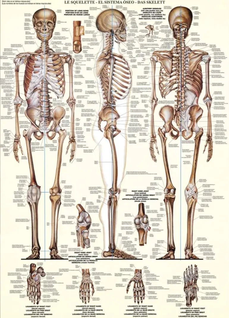 Anatomiskt motiv av ett människoskelett och dess uppbyggnad.
