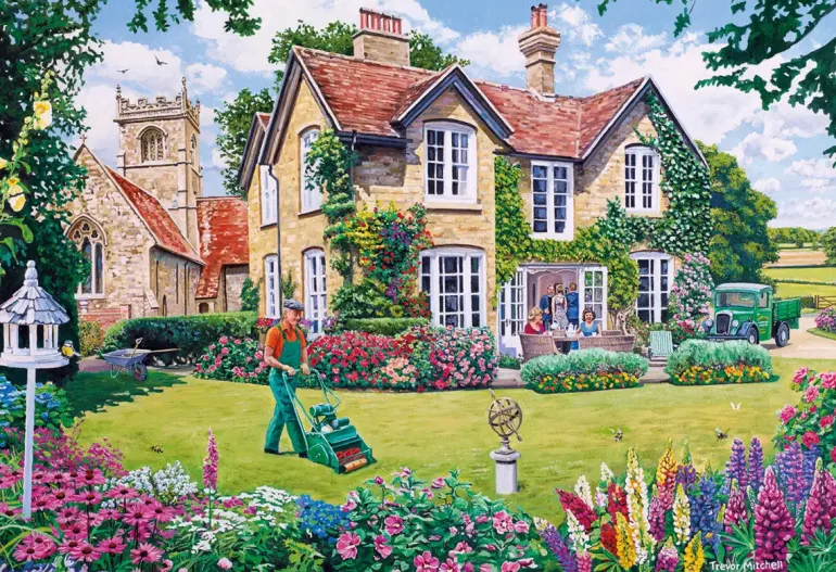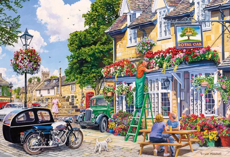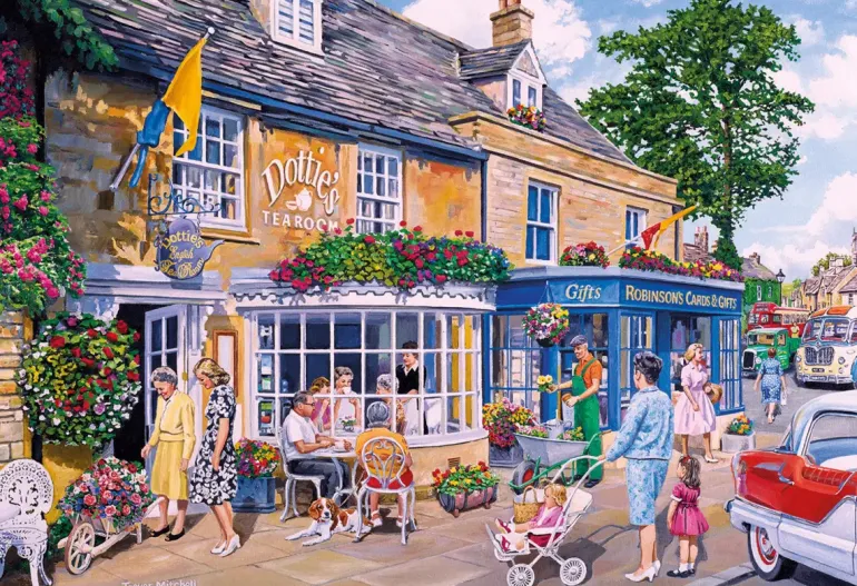 Följ med på en charmig rundtur bland blommande trädgårdar, mysiga bykaféer och välskötta villaträdgårdar. Varje motiv bjuder på en lugn stund i en idyllisk miljö där rosor klättrar längs staket, gräset klipps i solskenet och grannar stannar till för en pratstund.