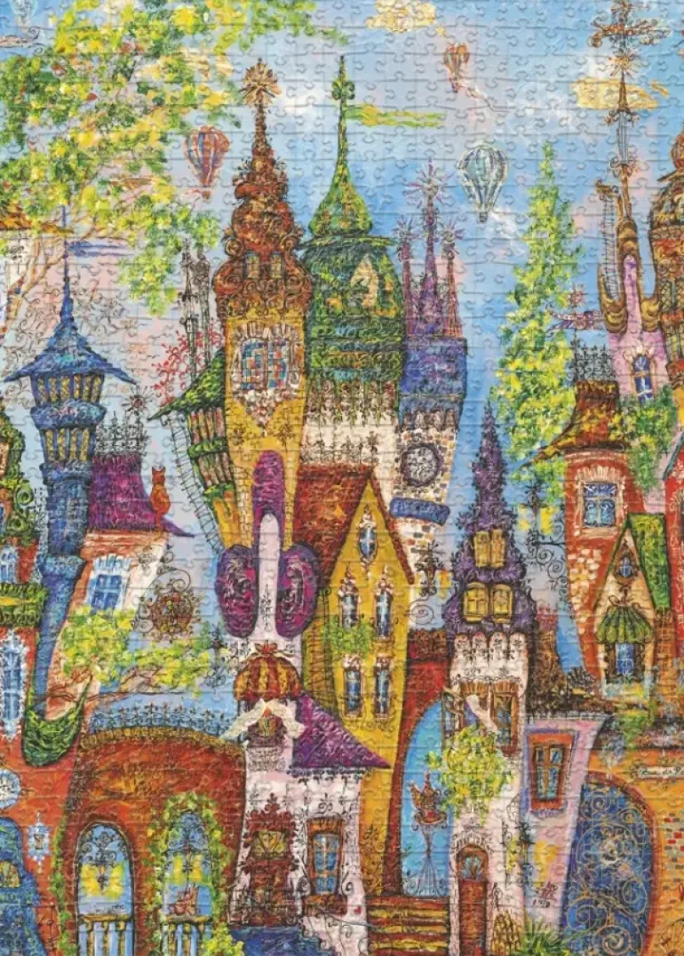 Följ med in i Tatyana Murovas sagolika by där färgstarka hus, snirkliga torn och flygande luftballonger skapar en magisk atmosfär. Ett lekfullt och detaljrikt pussel som bjuder på både utmaning och charm.