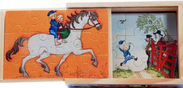 En fin trälåda som innehåller 4st träpussel på 12 bitar vardera, med motiv ur Astrid Lindgrens böcker om Emil i Lönneberga.
