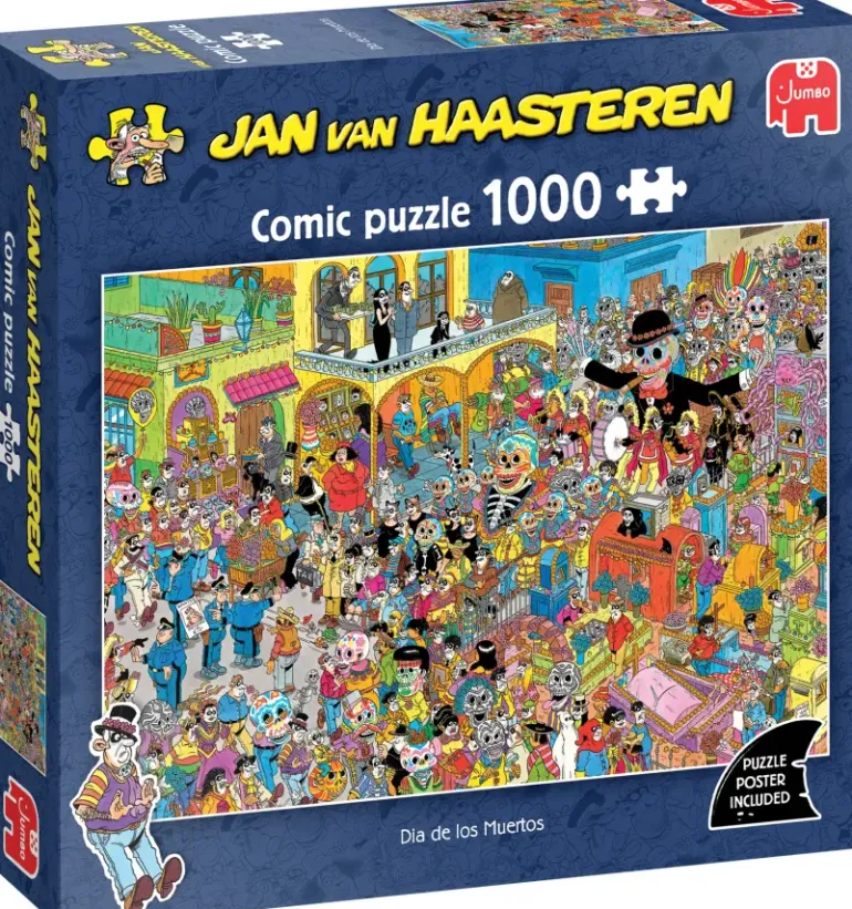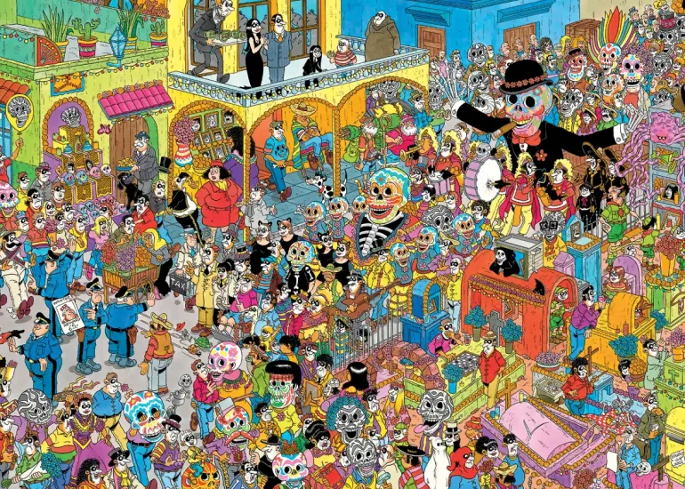 Det bästa och färgstarkaste av det mexikanska konsthantverket med skelettfigurer och kranier av socker eller papier maché visas också upp. Många städer har näst intill karnevalslika evenemang, precis som i det här fantastiska pusselmotivet av Jan Van Haasteren Studios. Kanske känner du även igen några bekanta figurer i bilden?