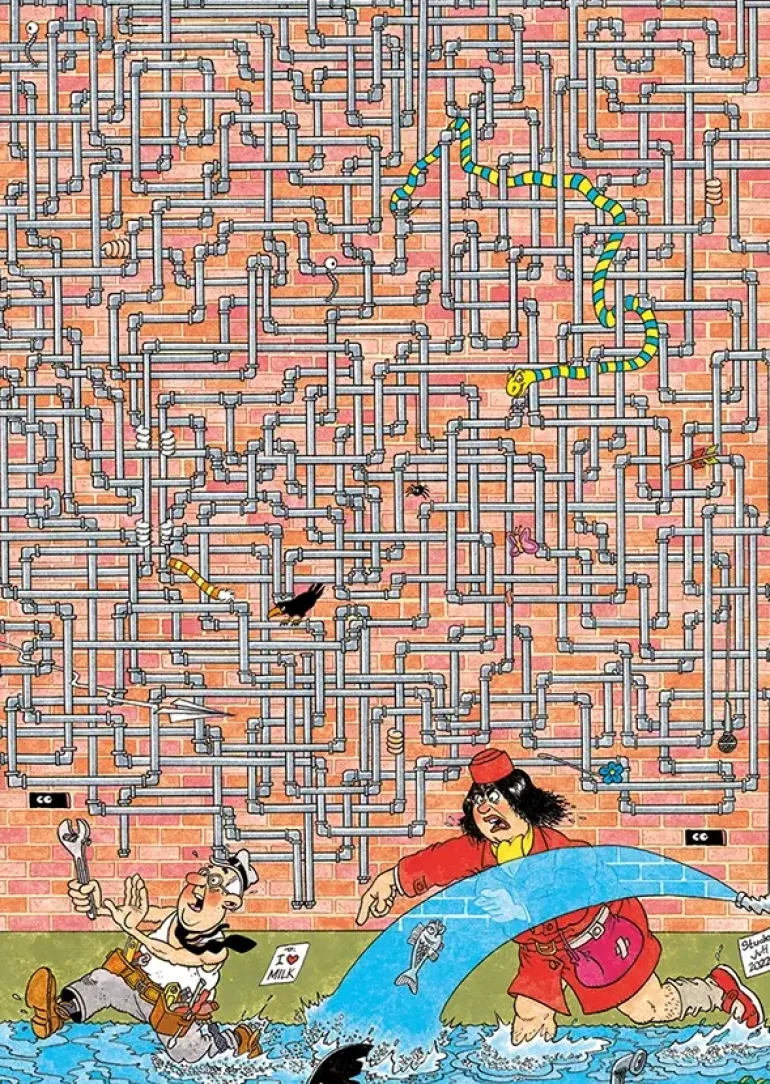 I Jan van Haasterens expertserie får vi följa 1-2 kända karaktärer ur Van Haasteren-familjen på egna små knepiga äventyr. Varje pussel är extra klurigt med många snarlika bitar. Den här gången tycks det vara en läcka någon stans, men vart?!