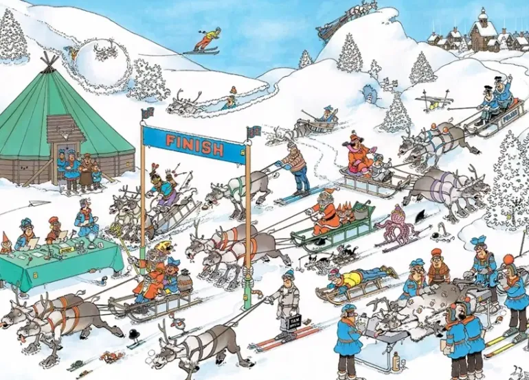Familjen Jan van Haasteren deltar i det fartfulla ren-racet. Vem kommer att bli först över mållinjen? Blir det jultomten med sin erfarenhet, eller är det någon annan som tar hem trofén? Jan van Haasteren har sin egen strategi för att vinna!