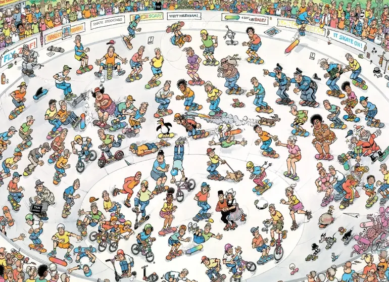 Jan Van Haasteren familjen roar sig kungligt i skateboardparken idag! Publiken häpnar över alla tricks och farliga manövrar. Svärmor susar genom den skålformade banan i hög hastighet, och Jan verkar också ha hittat sin plats i detta kaos av skateboardåkare, bmx-åkare och andra atleter. Håll i dig, nu åker vi!