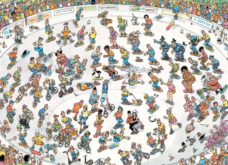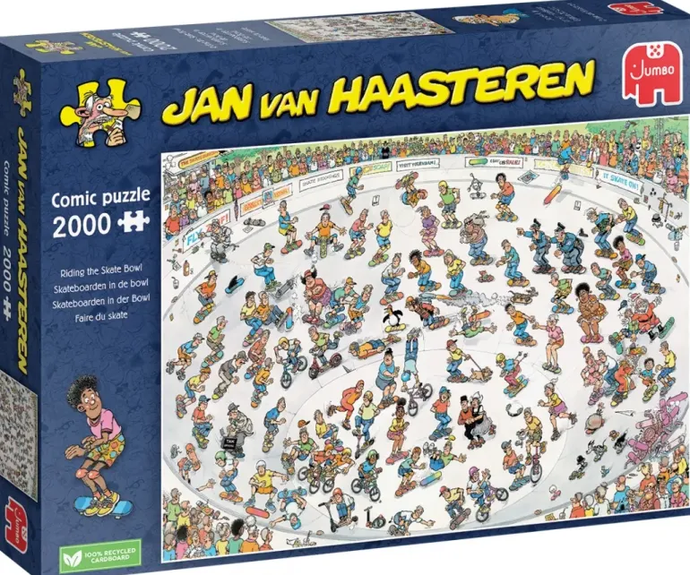 Jan Van Haasteren familjen roar sig kungligt i skateboardparken idag! Publiken häpnar över alla tricks och farliga manövrar. Svärmor susar genom den skålformade banan i hög hastighet, och Jan verkar också ha hittat sin plats i detta kaos av skateboardåkare, bmx-åkare och andra atleter. Håll i dig, nu åker vi!