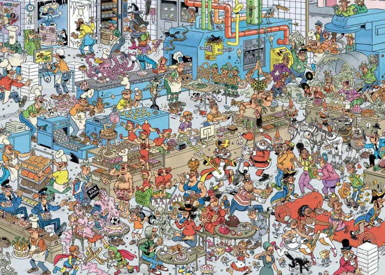 Idag tar Jan van Haasteren familjen med oss till det lokala bageriet. Arbetsmetoderna i detta bageri är verkligen en aning speciella och det är nästan svårt att urskilja vilka som verkligen arbetar på bageriet och vilka som är kunder. Alla verkar i alla fall njuta av dagen och ha roligt tillsammans, eller kanske inte riktigt alla….spöket verkar nämligen ha hamnat i trångmål!