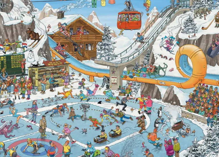 Vinterspelen är igång och här finns i stort sett alla vintersporter representerade. Familjen Jan Van Haasteren är självklart här för att njuta av evenemanget och den goda korven som serveras. För en del tävlande går det kanske lite bättre än för andra, och både Octo och taxeringsmannen verkar onekligen vara ute på hal is!