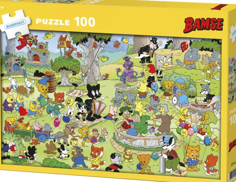 Pussel med 100 bitar och motiv av världens starkaste björn Bamse. Bamse är i äventyrsparken med vänner och familj. I parken kan man dansa på dansbanan, bli dragen av en åsna, kasta prick och grilla korv. Motivet är färgglatt och detaljrikt. Bitarna är större och mer greppvänliga än vanliga pusselbitar.