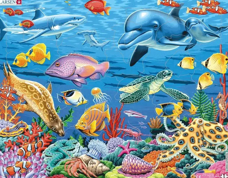 Två nyfikna delfiner hälsar på i korallrevet. Här ser de en färgsprakande samling av många olika djur.