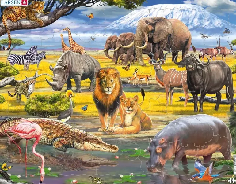 På den afrikanska savannen ser vi flera olika vilda djur. I bakgrunden ett snötäckt berg.
