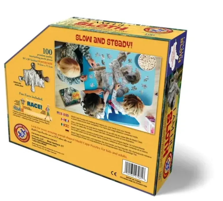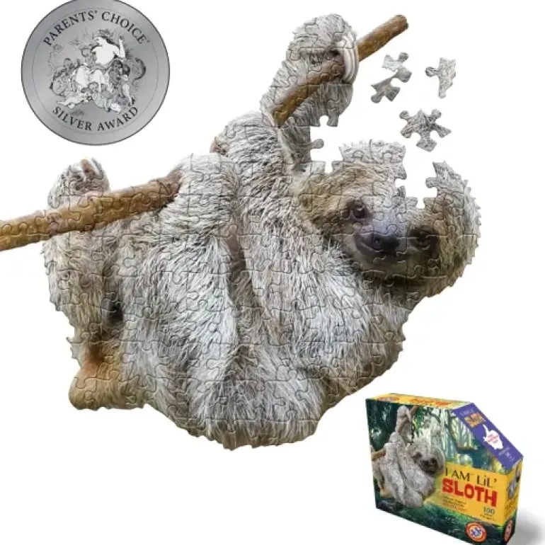 En sengångare tar sig en liten tur längs en hängande lian. Unikt figurskuret pussel med formen av sengångare på lian.