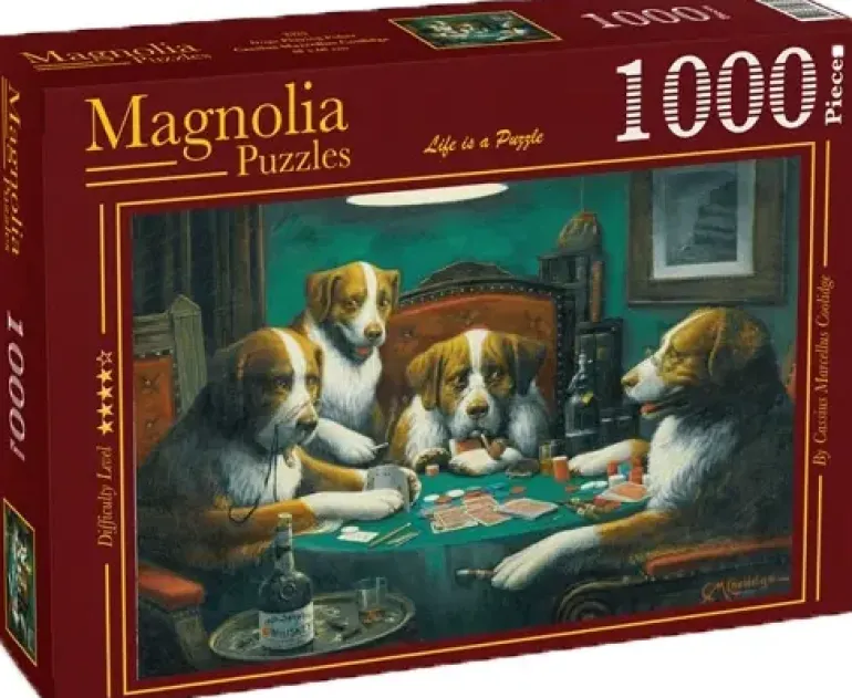 Cassius Marcellus Coolidge har målat det här utmanande och roliga pusselmotivet av hundar under ett intensivt pokerspel.
