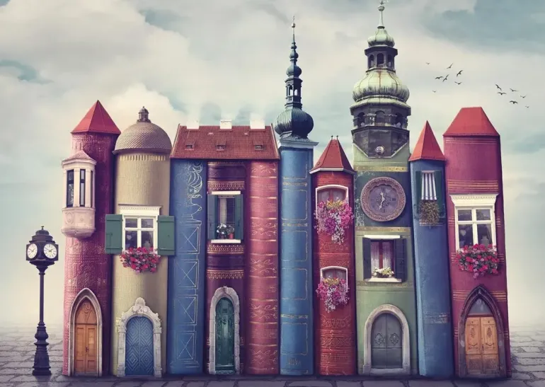 Fem magiska hus i form av bokryggar i olika färger står tätt ihop. I fönstren dignar vackra blommor och varje port har unika dörrar i trä. Husen står på en stenbelagd gata och i bakgrunden syns tät dimma med moln och en flock svävande fåglar. Motivet är illustrerat av konstnären Elena Schweitzer.