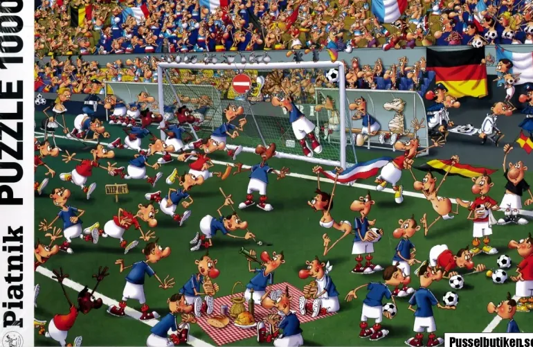 Ett skämtsamt tecknat motiv med fotbollstema.