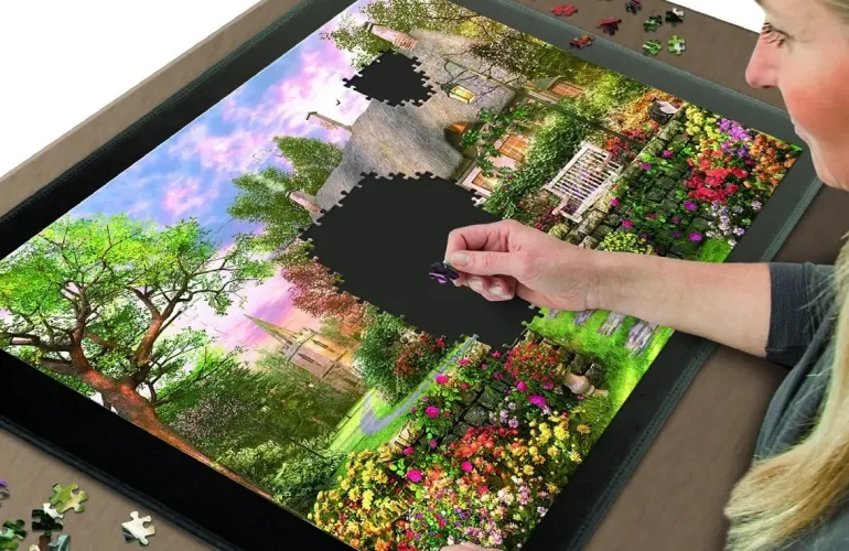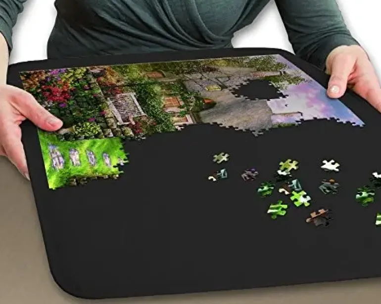 Smidig pusselplatta att lägga pussel på, med en yta som gör att bitarna inte glider runt på plattan. Plattan är lätt att flytta runt och rymmer ett pussel på upp till 1000 bitar (ett pussel som är ca 68 x 49 cm stort).