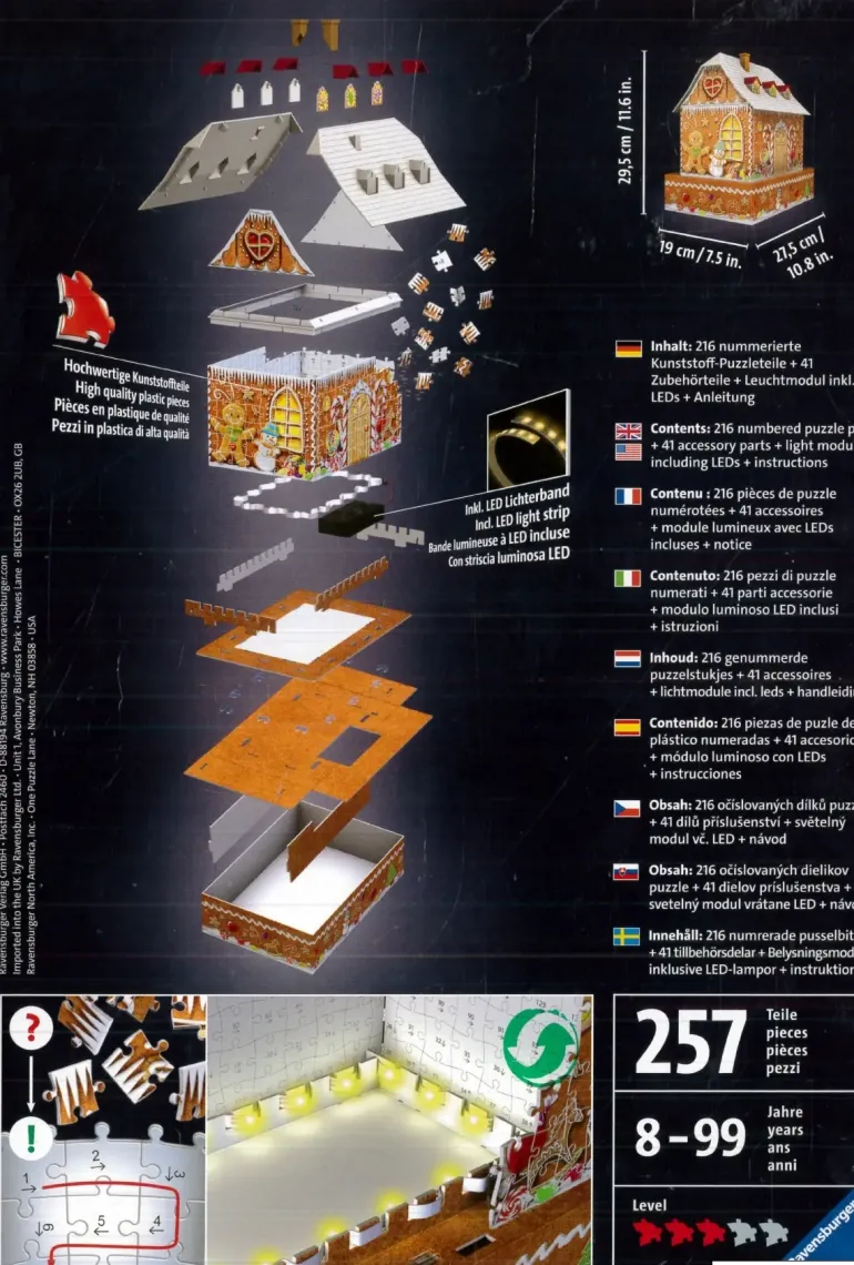 Innehåller 216 numrerade pusselbitar, 41 accessoarbitar, ljusmodul med LED & instruktioner. Behöver 3st AAA batterier, medföljer ej.