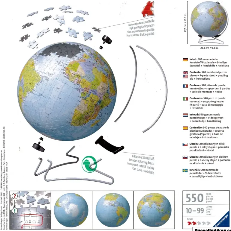 Innehåller 540 numrerade pusselbitar, 9-delars stativ, hjälpmedel & instruktioner.