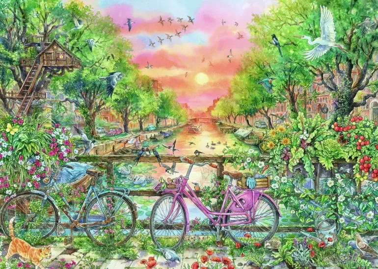 Det klassiska motivet av två cyklar som parkerats på en av Amsterdams alla broar mot en sprakande solnedgång. Men den här gången har konstnären skapat något utöver det vanliga. Hela staden har fått ett grönskande liv där blommor, fåglar och andra djur fullkomligen stormtrivs! I ett av träden längs med allén har någon byggt ett hus, likt en lyxig trädkoja. Ett klassiskt pusselmotiv i helt ny tappning och med massor av detaljer, skapat av konstnären Ute ThöniBen.