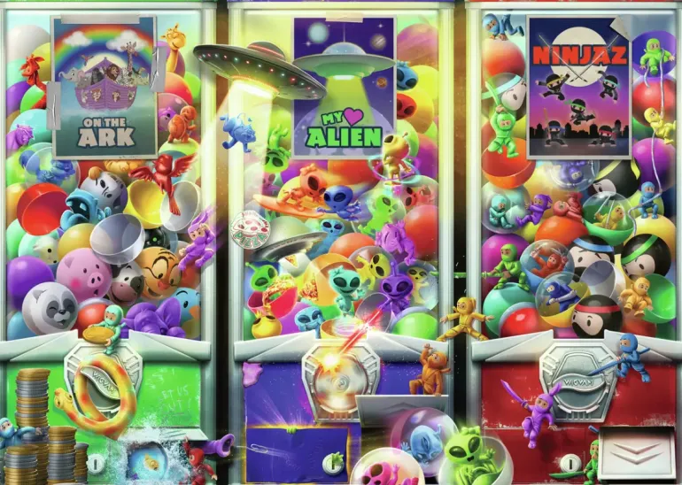 Ett kollage av neonfärgade rymdvarelser, ninjor och djur på Noas ark. Motivet är skapat av illustratörer på Wigwam Studios