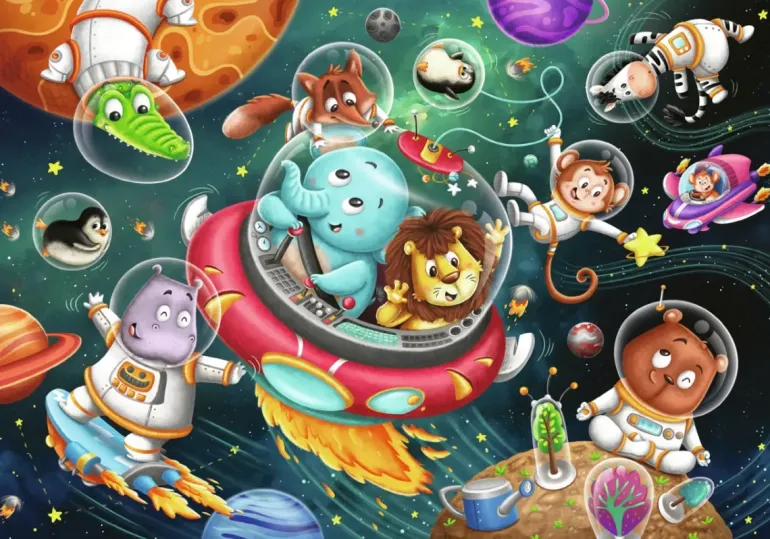 Två pussel på 12 bitar vardera, med olika motiv av söta djur på upptäcktsfärd i rymden.