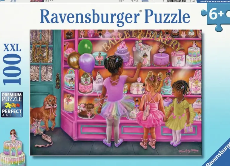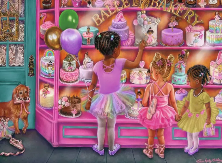 Tre söta små ballerinor har stannat till för att beundra bageriets vackra skyltfönster. Det är knallrosa och fullt av söta läckerheter! En hund och en kattunge har också fått tag på ett par ballerinaskor som verkar goda att smaska på!