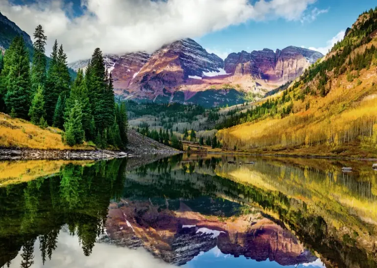 I detta motiv kan vi se bergstoppar i en rosa ton som sträcker sig mot en blå himmel. Vid bergets fot syns skogen med bladträd som fått gulnade blad och gröna granar. Berget och skogen speglar sig i en blank sjö i förgrunden.