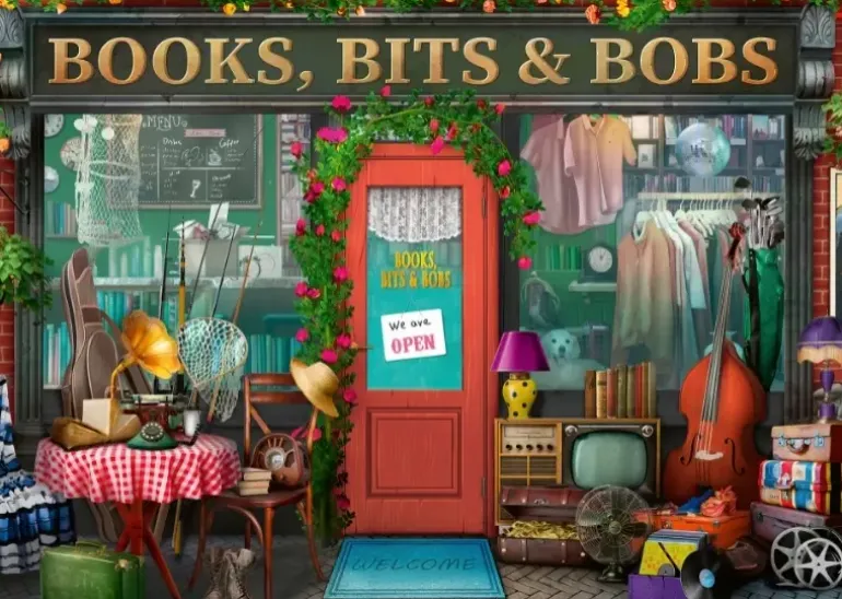 Butiken ”Books, Bits & Bobs” är öppen! Här finns alla möjliga produkter, allt från grammofoner till kläder. Kanske är det en second hand butik? I skyltfönstret tittar en hund fram och menyn på väggen skvallrar om att butiken också har ett mysigt café.