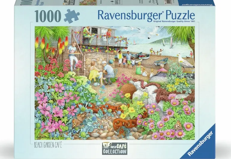 Det är en fin dag på stranden och det lilla strandcaféet är välbesökt. I förgrunden ser vi en trädgård i full blom och längre in i motivet en strand med glada barnfamiljer, hungriga måsar och vilande fiskebåtar. Några är ute och vindsurfar på vågorna och caféets flaggor fladdrar i den svalkande brisen.