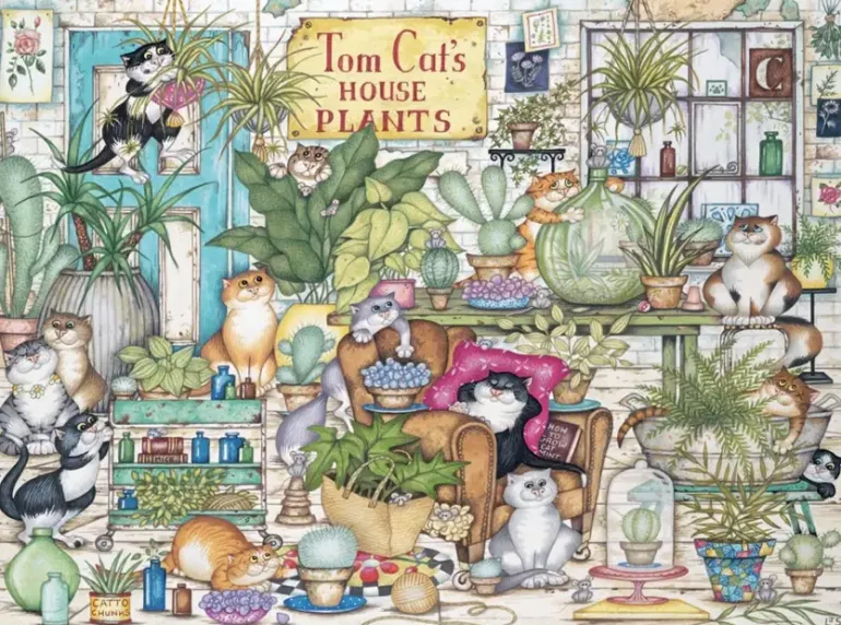 Här trängs en mängd skojiga katter med en stor variation av krukväxter. Ett detaljrikt motiv i pastellfärger av katt-konstnären Linda Jane Smith. Medan du pusslar kan du också roa dig med att hitta alla små möss som tittar fram här och var, hur många är de egentligen?