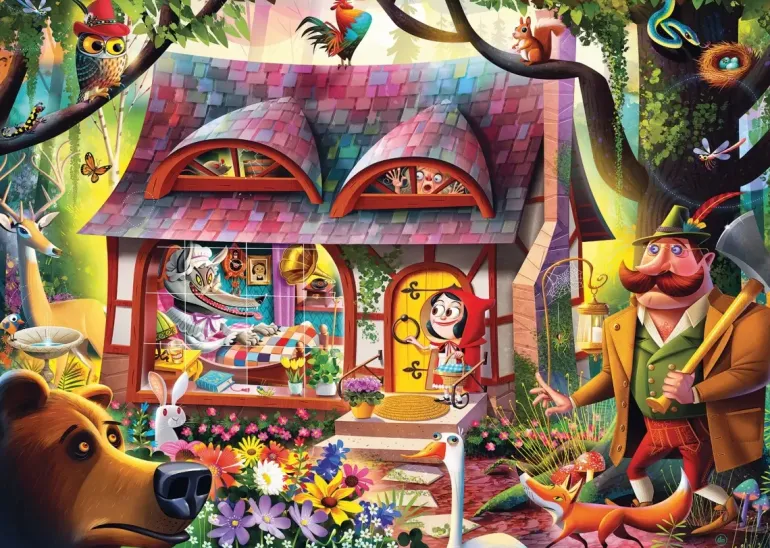 Den klassiska barnsagan Rödluvan och Vargen, illustrerad av konstnären Dean MacAdams. Rödluvan ska just knacka på dörren till Mormors hus och genom fönstret ser vi den utklädda vargen ligga nedbäddad i sängen. Utanför syns skogen och alla djur, och som tur är står jägaren redo att komma till henens undsättning!