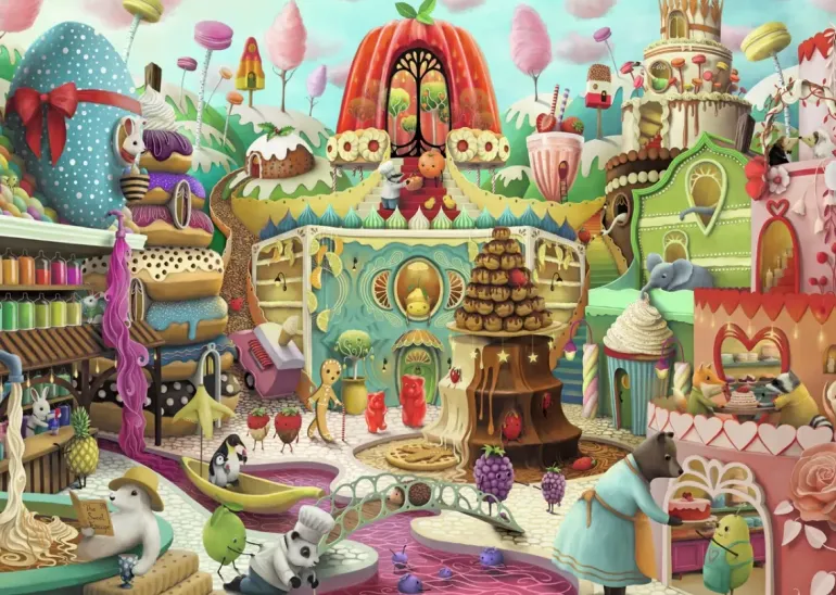 Haughton har återigen skapat en fantastisk värld där byggnaderna är konstruerade av bakverk och godis, och träden toppas med macarons och sockervadd! Här kan glada jordgubbar ta sig ett dopp i saft, en isbjörn badar i choklad och en elefant tar sig en smakbit av taket gjort av grädde.