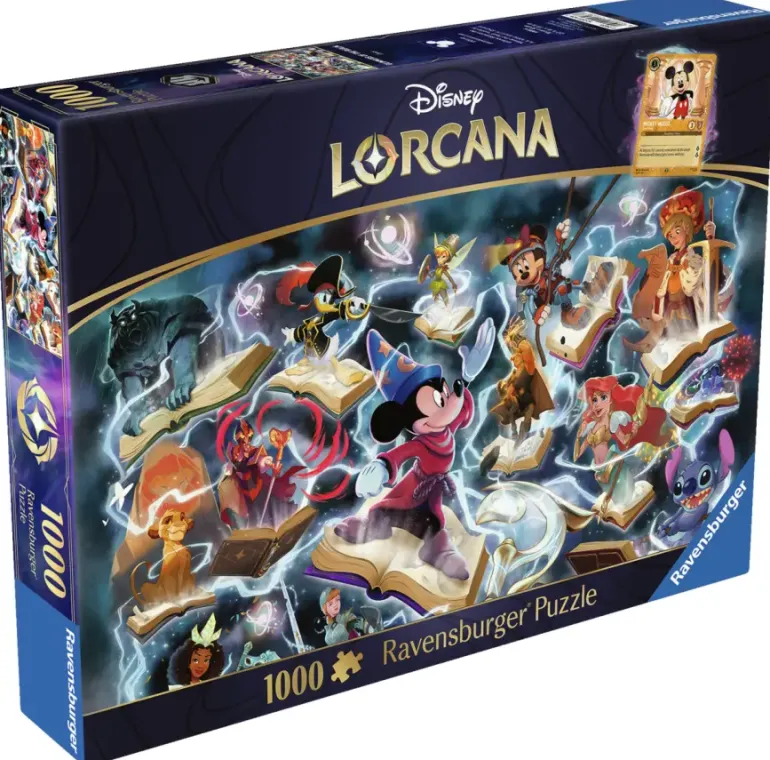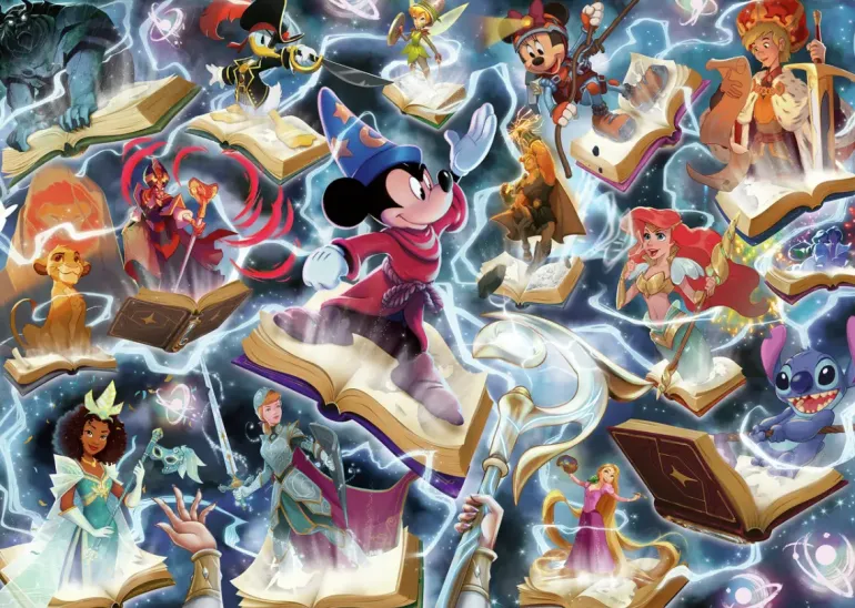 Ett mäktigt pusselmotiv med tema från Disneys samlarkortspel Lorcana. I centrum ser vi Musse Pigg själv i trollkarsmundering, och han är omgiven av kända karaktärer ur Disneys magiska värld. I spelet står färgen ”stål” för styrka, beslutsamhet och fysisk kraft.