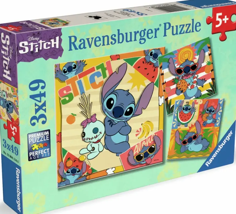 Tre pussel på 49 bitar vardera, med olika motiv av Disneys älskade karaktär ”Stitch”.
