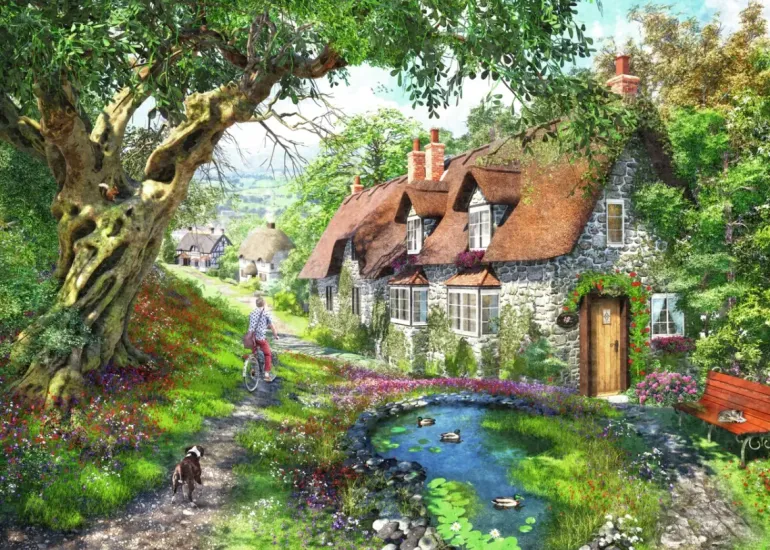 En person cyklar på en landsväg med sin hund glatt springande efter. Längs vägen blommar blommorna och i ett stort träd sitter en liten ekorre och mumsar på något gott. Här finns en damm med änder och längre fram skymtar en pittoresk by med korsvirkeshus och stenhus med tak av vass. Ett harmoniskt solskensmotiv som inbjuder till vila och harmoni av konstnären Dominic Davison.
