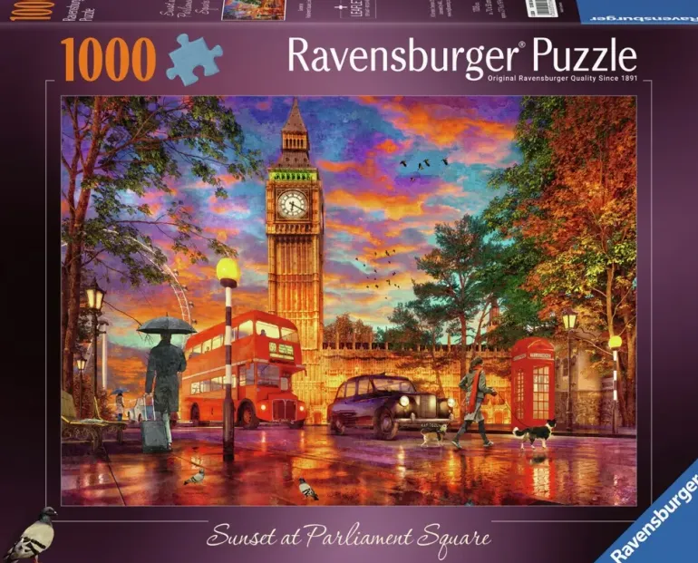 Det är kväll i London och solen är på väg ner över Parliament Square. Det har nyss regnat och rosa molnen speglastillsammans med skenet från gatlyktorna i de våta gatorna. Vi ser människor som promenerar med paraplyer och hundar i koppel. Ett par duvor spatserar också omkring och på gatorna åker stadens signum i form av svarta taxibilar och röda bussar. Såklart ser vi också en klassiskt röd telefonkiosk, Big Ben och en skymt av pariserhjulet ”The London Eye”.