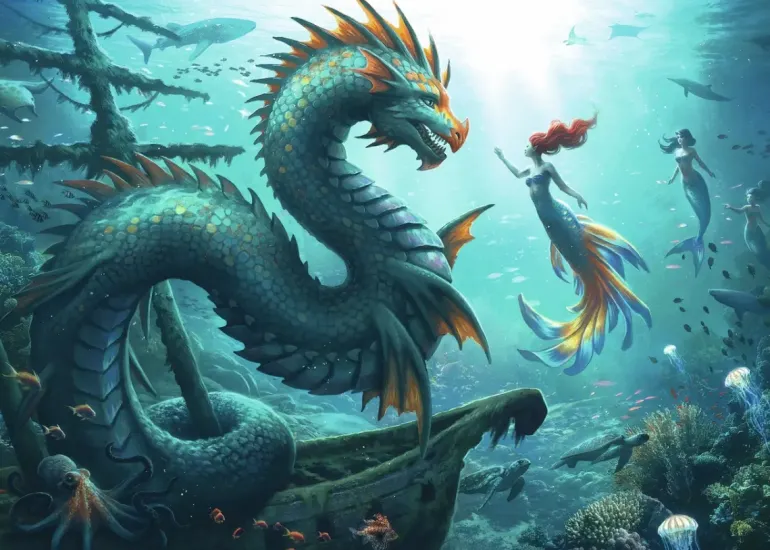 Långt ner i havets djup möts en mäktig sjöorm och en sjöjungfru. De är omgivna av havets alla djur och ett skeppsvrak täckt av alger och sjögräs.
