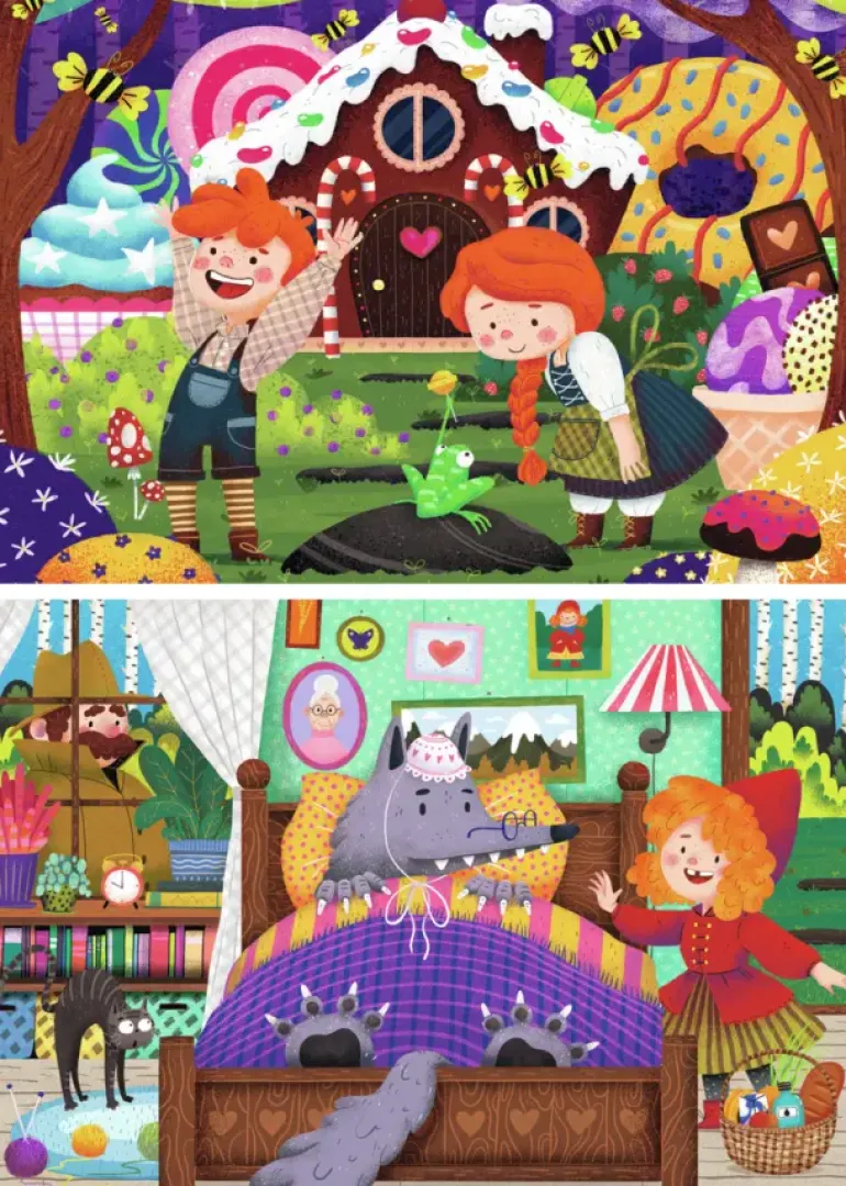 I det första motivet ser vi Hans och Greta utanför häxans pepparkakshus, och i det andra motivet står Rödluvan med sin korg hemma hos Mormor. Hon pratar med henne där hon ligger i sin säng…men är det verkligen Mormor? Har hon inte fått ovanligt stora tänder?!