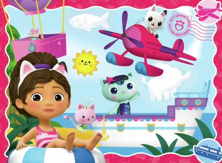 Nyp dig i örat och stå helt still….bli liten och följ med Gabby in i katternas dockhus! Idag spenderar kompisarna sin dag vid havet, solen skiner och stranden är härlig. De har både en stor båt, ett flygplan, en luftballong och en badring att leka med.
