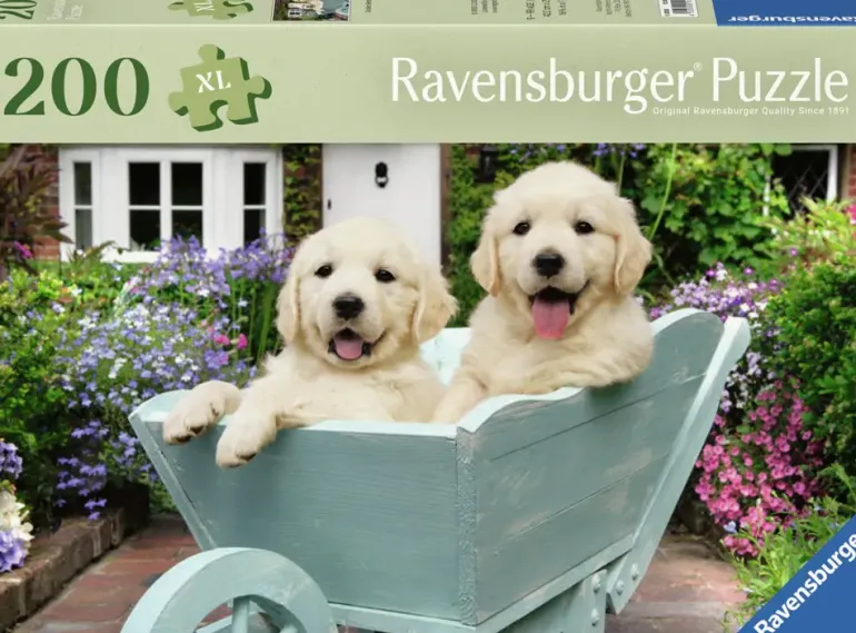 Två Golden retriever valpar sitter glatt i en skottkärra av trä. I bakgrunden skymtas ett hus och en trädgård full av rosa och lila blommor.