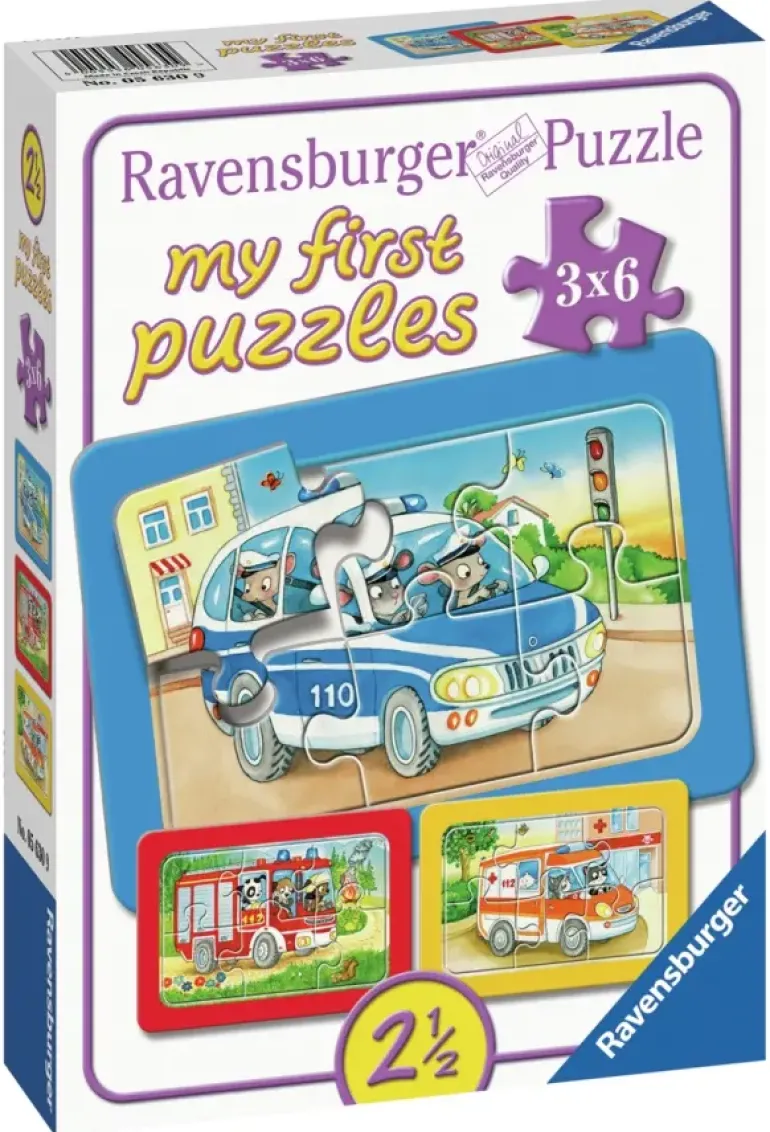 Tre charmiga barnpussel på 6 bitar vardera, med djur i olika utryckningsfordon. I den här staden är katterna ambulansförare, hundarna brandmän och mössen utgör stadens polispatrull.