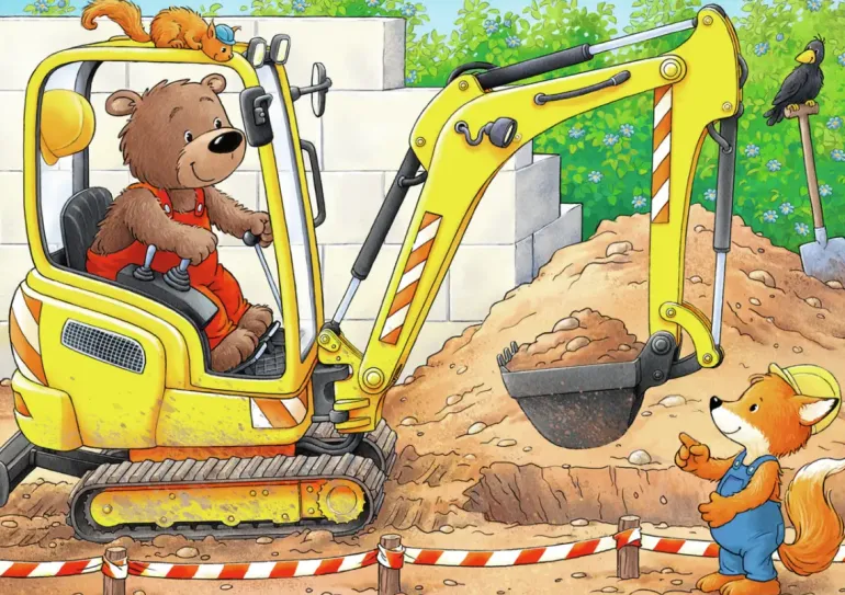Fyra pussel på 2, 4, 6 och 8 bitar. Samtliga med olika motiv av djur som arbetar i olika tunga fordon. Ett perfekt motiv för barn som gillar djur, traktorer, grävmaskiner och lastbilar!