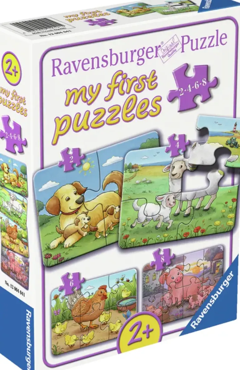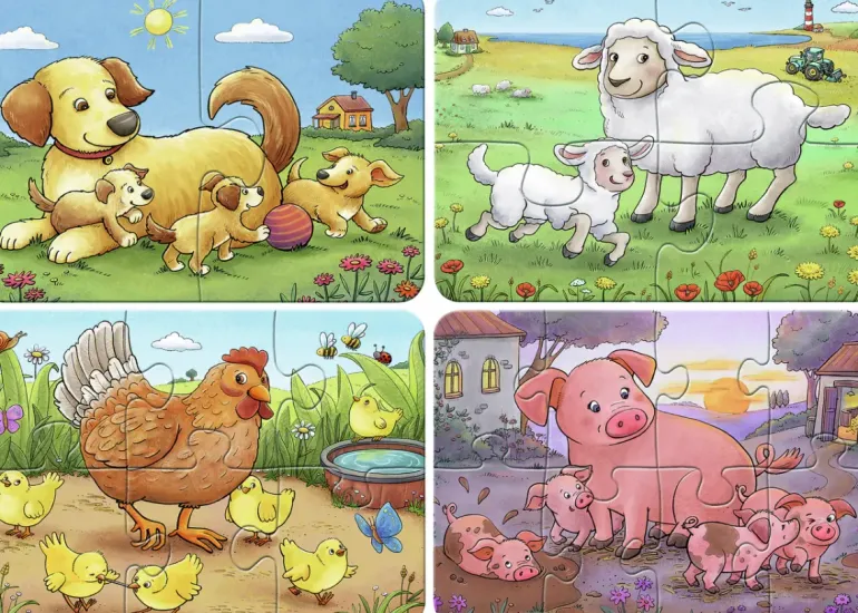 Fyra pussel på 2, 4, 6 och 8 bitar. Samtliga med olika motiv av djur på landet med sina ungar. Vi ser en hund med valpar, ett får med sitt lamm, en höna med kycklingar och en gris med kultingar. Ett perfekt pussel för små barn där de får öva både motorik, logik och djur på en och samma gång.