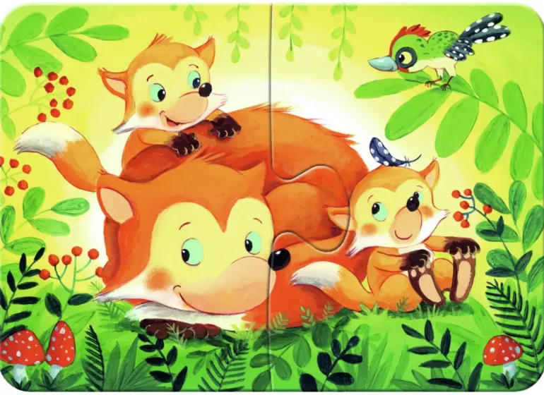 Fyra pussel på 2, 4, 6 och 8 bitar. Samtliga med olika motiv av djur i skogen och deras ungar. Vi ser rävar, igelkottar, ekorrar och rådjur.