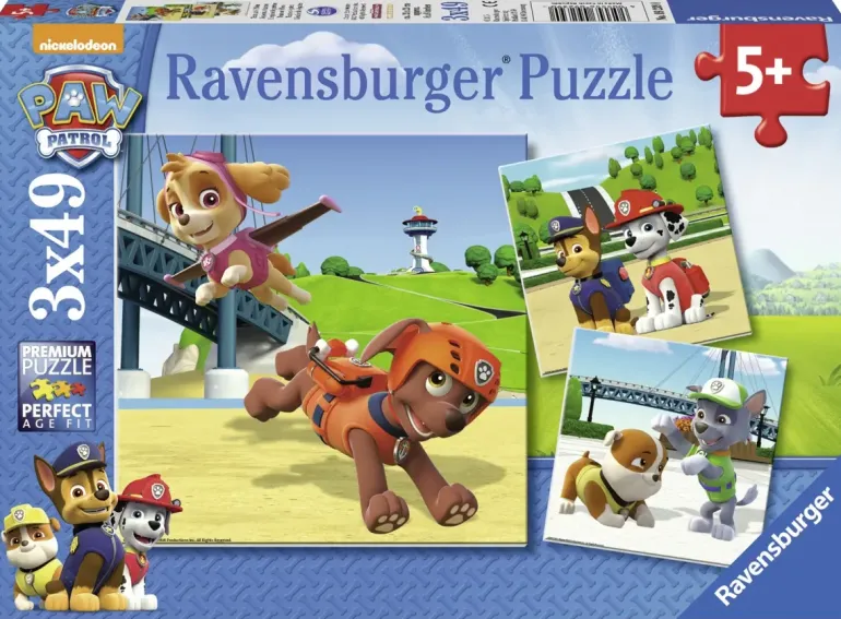 Tre pussel på 49 bitar vardera, med olika motiv ur Paw Patrol.