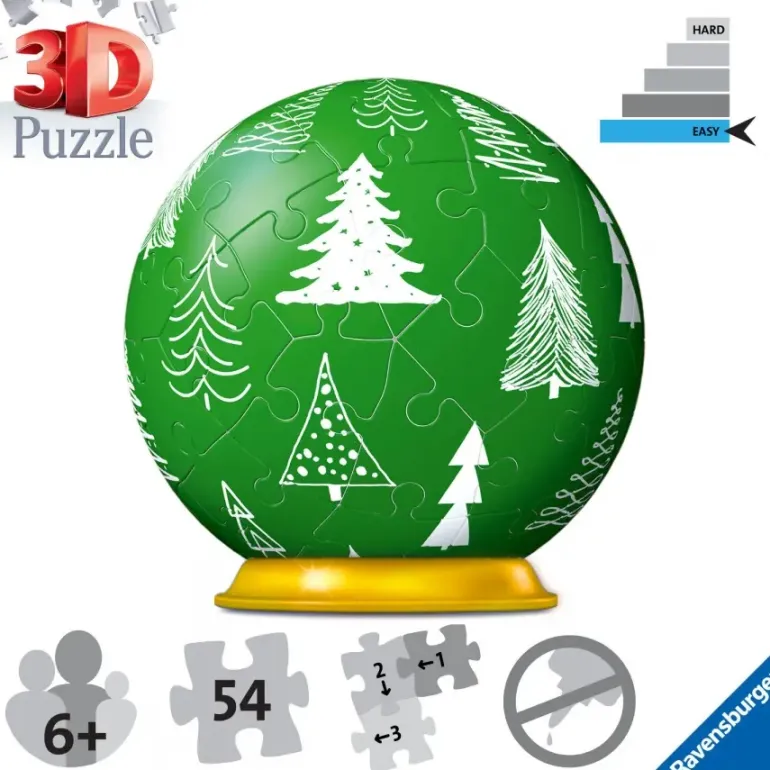 Pusselbitarna är i plast och går enkelt att sätta ihop till en robust och stark modell (med easy-click funktion), inget lim behövs. Pussla antingen på fri hand eller med hjälp av siffrorna på baksidan av pusselbitarna. Det ingår snöre så att du kan hänga din färdiga julgranskula i granen. Vill du istället visa upp din julkula ingår det också ett praktiskt ställ att placera den på.