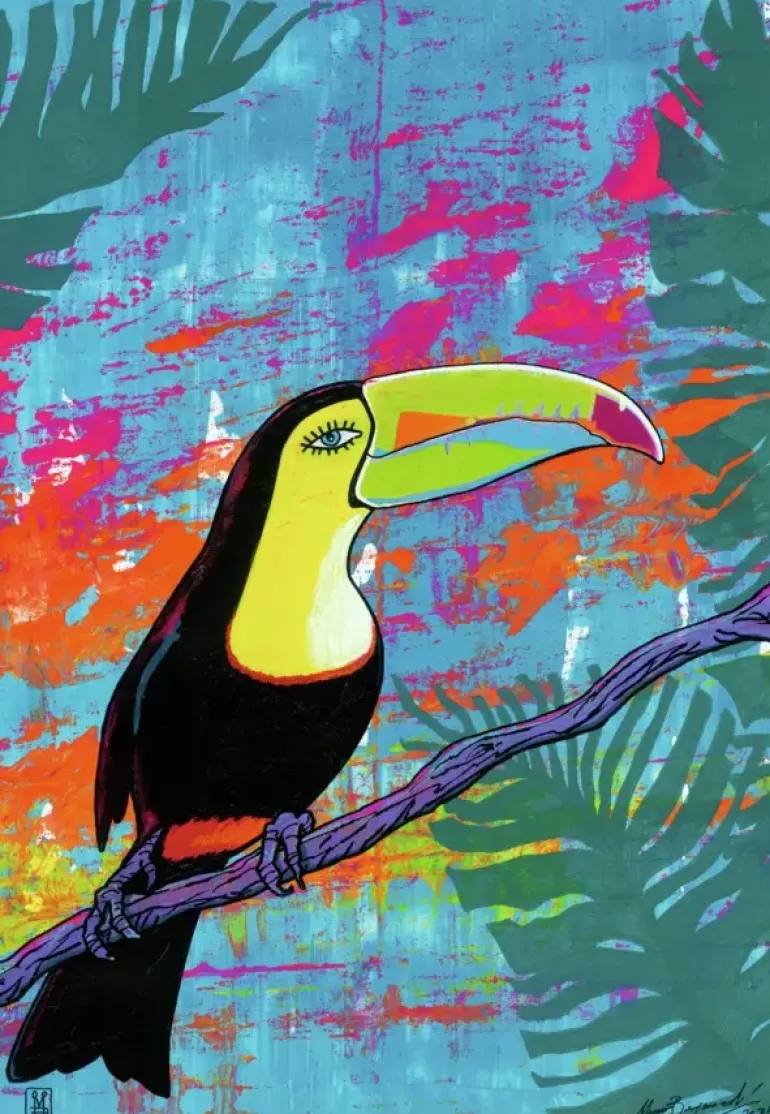 En Tukan har tagit plats på en gren, i bakgrunden syns gröna löv och färger i blått, rosa, orange och gult.