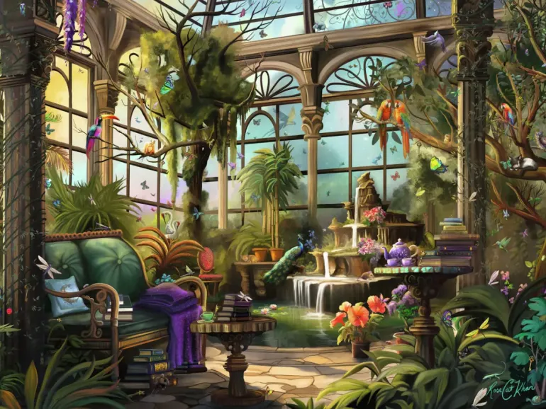 I ett stort växthus finns tropiska blommor, höga träd, en inbjudande divan och en porlande fontän. Téet är serverat i en fin kanna och här finns massor av böcker redo att läsas. Slå dig ned en stund i denna lugna oas och lyssna på papegojornas tjatter och fjärilarnas vingslag!