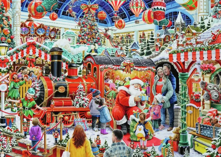 I en väldekorerad butik har tomten tagit plats för att dela ut Julklappar till alla snälla barn. Man har ställt upp ett fint rött lok fullt av julklappar och ett litet hus där renar sticker ut sina huvuden genom fönstret. Taket är av glas och mot den stjärnklara himlen hänger luftballonger, stora julkulor och julstrumpor. Ett härligt julmotiv fullt av detaljer i rött och grönt!